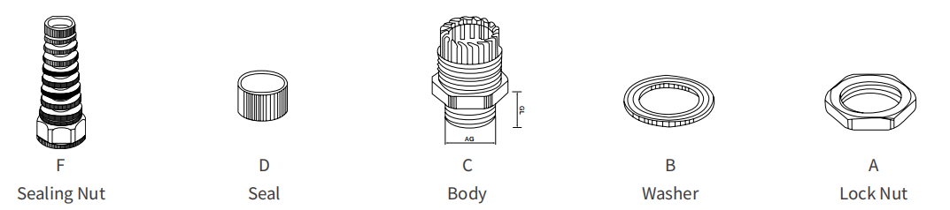 • Materials: Part A.C.F is made of UL approved nylon PA66, part B.D butadiene rubber (NBR) or EPDM
